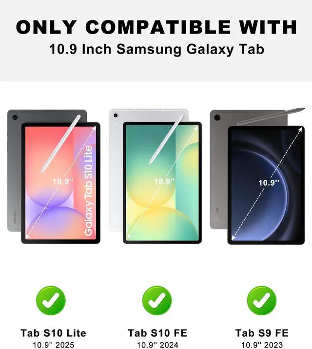 • Compatible with Samsung Galaxy Tab S10 Lite/S10 FE/S9 FE/S9The case with keyboard is compatible with Samsung Galaxy Tab S10 Lite 5G 10.9 inch (Model: SM-X400/X406B) 2025 Release, for Samsung Galaxy Tab S10 FE 5G 10.9 inch (Model: SM-X520/X526B/X528U) 2025 Release, for Samsung Galaxy Tab S9 FE 5G 10.9 inch (Model: SM-X510/X516B/X518U), for Samsung Galaxy Tab S9 11 inch (Model: SM-X710/X716B/X718U) 2023 Release tablet. Please check your tablet model before placing an order.