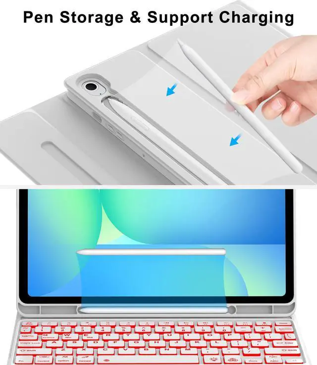 ^^ Rechargeable Keyboard With Long Battery LifeFast charging, long standby time. It takes 2.5 hours to fully charge, and for samsung tablet s10 lite 2025 case keypad can work continuously for 90 hours. The key board case for galaxy s9 11inch tab has a standby time of 90 days. Unconsciously, the keyboard for samsung tab s10 fe 2025 can save an additional expenditure of a battery. ^^ Galaxy Case with Pen Holder & Support ChargingSmart cover for samsung galaxy s9 fe keyboard leaves space for the Stylus to be charged and compatible, and will not hinder the combination of the Stylus and the tablet. No need to worry about the Stylus getting lost, running around, or inconvenient to carry. ^^ Quality and Efficient TypingProfessional key layout brings a clean, precise and comfortable typing experience. Keyboard case for samsung galaxy tablet designed for ipad and other tablets, this for samsung tablet keyboard case 10.9 inch that makes your tablet work and type as fast as a laptop. The backlit keypad for galaxy tab s10 lite case is equipped with shortcut keys to control the media (next, back, pause, volume, mute), which is very convenient in practice.