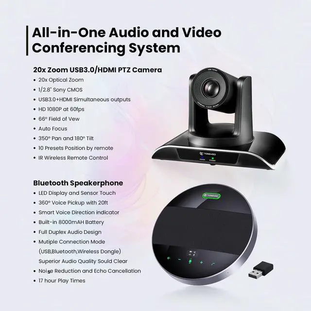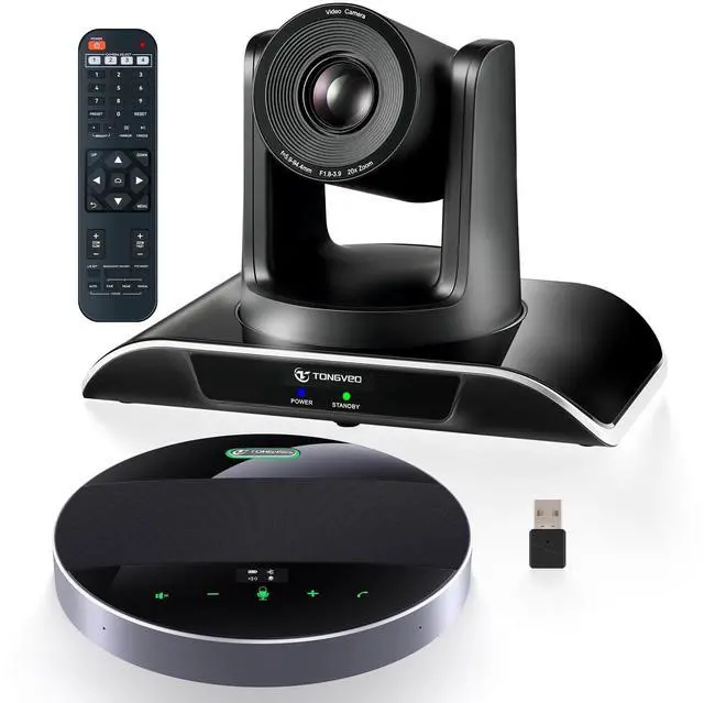 20x Zoom Conference room Camera systemTONGVEO All-in-one Conference room camera system consists 20x optical Zoom HDMI PTZ camera and Bluetooth speakerphone, Perfectly combination of the USB HDMI camera and Conference Speaker function, this bundle is conference camera with USB and HDMI interface to connect your laptop PC or Smart TV, then the Conference microphone and HD conference camera can simultaneously work, 20x Zoom camera see farther, and the upgrade speakerphone hear more clearly ^^ Great Video and Audio CombinationThe Conference camera adopts 1/ 2.8 inch" CMOS with 2.38 megapixel enhanced image sensor, Full HD 1920* 1080P camera can deliver crisp video at 60fps, 20x optical Zoom see farther, PTZ camera has HDMI and USB 3.0 outputs, which can output videos simultaneously, While the full-duplex conference microphone can pick up voices distance 20ft, 20X zoom professional webcam and upgraded conference speaker smart collaboration idea for Medium or Larger Meeting room ^^ Smart 360 Omnidirectional microphoneThe Conference speakerphone adopts a hands-free microphone and hands-free speaker design, to speak and be heard simultaneously, 360 omnidirectional mics can pick up sound with 20ft, connected via USB, Bluetooth 5.0, Dongle, no drivers need, the conference microphone built-in 8000mAh battery, 17 hours work times, the LED indicator can identify the direction of the speaker and display the battery level, suitable for a larger meeting room of 60 square meters ^^ Easy video conferencingThe enterprise-level 20x Zoom video Camera be rotated 350 horizontally and 180 vertically, Launch video meetings with the USB or HDMI cable connection to your laptop, desktop, computer, or Smart TV.