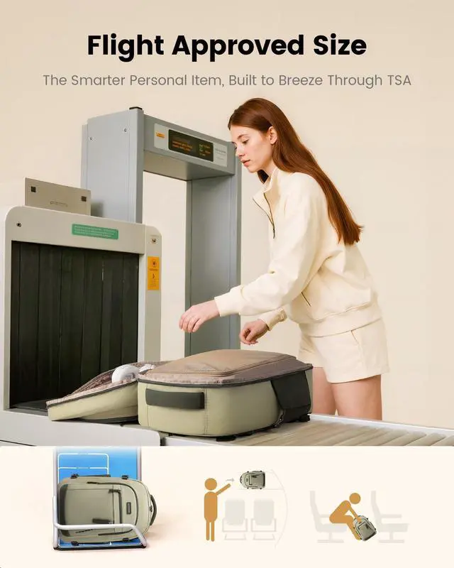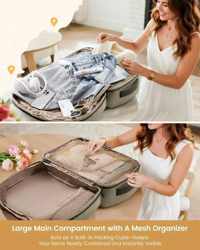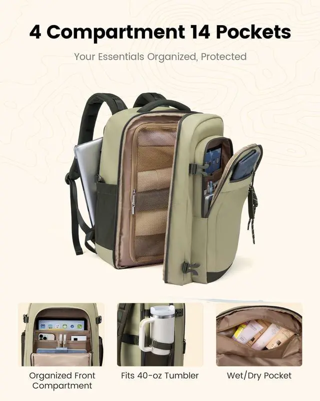 Airline-Approved & Effortless BoardingThis carry-on backpack measures 18 14 8 inches, fitting perfectly under airplane seats or in overhead bins. Its approved by major budget airlines including Spirit, Frontier, and JetBlue. The 180 opening design allows for quick security screening, making it your ideal personal item for hassle-free travel. ^^ 40L Spacious & Organized StorageThis travel backpack features a 40L large capacity, 4 compartments, and 14 pockets to keep your travel essentials neatly organized, easily holding 37 days of belongings. The main compartment has a large mesh divider thats faster and more convenient than buckle straps, while protecting irregular items from shifting or falling out.
