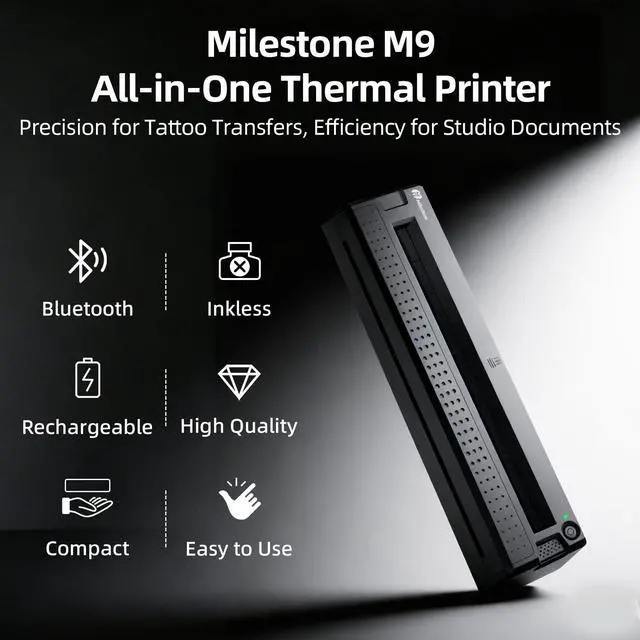 Upgraded 2-in-1 Tattoo Stencil & Document PrinterThe Milestone M9 is the all-in-one solution that streamlines your studio workflow. Instantly switch from printing sharp, high-resolution tattoo stencils on transfer paper to producing smudge-proof client documents on thermal paperall with one compact tattoo printer machine that saves space and simplifies operations. ^^ Professional Thermal Tattoo PrinterSay goodbye to messy carbon paper forever. This thermal tattoo transfer printer delivers clean, accurate stencils every time. Create intricate transfer patterns in secondsperfect for fine-line, geometric, and realistic designswith no smudging or material waste.