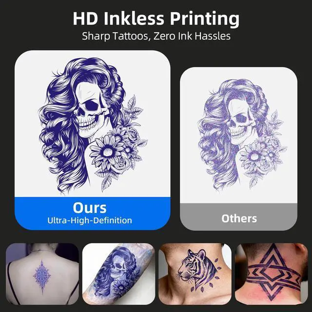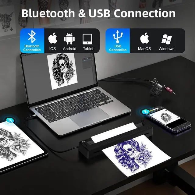 Its not just for professionals: print temporary tattoos for practice or client previews, making it the ideal choice for both beginners and experienced artists. ^^ Portable Wireless Tattoo Stencil PrinterWeighing just 1lb with a long-lasting built-in battery, this wireless tattoo stencil printer provides true mobility. Fit this stencil printer for tattooing easily in your tattoo kit for conventions, guest spots, or pop-up studios. Print professional stencils anywhere without a power outlet, making it the ideal portable tattoo stencil machine for the modern, on-the-go artist. ^^ Stable Bluetooth & USB-C ConnectivityAs a versatile Bluetooth tattoo stencil printer, it connects seamlessly to iOS/Android devices via Bluetooth or to laptops via USB-C. Enjoy uninterrupted printing of intricate designs and documents, with reliable performance whether you're in the studio or on the move. ^^ Smart App for Streamlined WorkflowThe dedicated "TATTOO PRT" app makes this professional tattoo stencil printer incredibly intuitive. Import designs, adjust sizing, and print stencils or documents with one clicksimplifying prep work for professionals while being accessible enough for enthusiasts starting their tattoo journey.