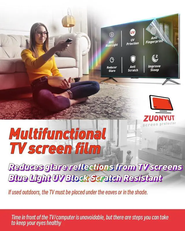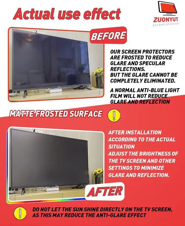 Anti Glare: The surface is coated with an anti-glare frosted finish to reduce visual distractions and reflections and glare on the screen, allowing you to see the content on the screen clearly in the room. The screen brightness needs to be adjusted up after installation. If used outdoors, the TV must be under the eaves or shade