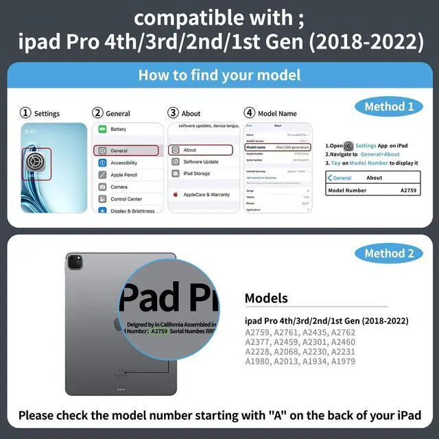 Models include: 2022 12.9 -inch Pro 6th gen (A2436, A2437, A2764, A2766); 2021 12.9 -inch Pro 5th gen (A2378, A2379, A2461, A2462); 2020 12.9 -inch Pro 4th gen (A2229, A2069, A2232, A2233); 2018 12.9 -inch Pro 3rd gen (A1876, A2014, A1895, A1983). If you're unsure about compatibility, please check the model number starting with "A" on the back of your iPad. If you still have any doubts or need further assistance, feel free to reach outwe're happy to help! ^^ Innovative and
