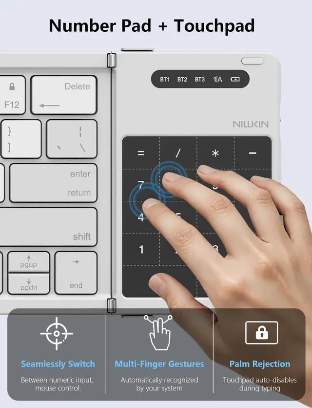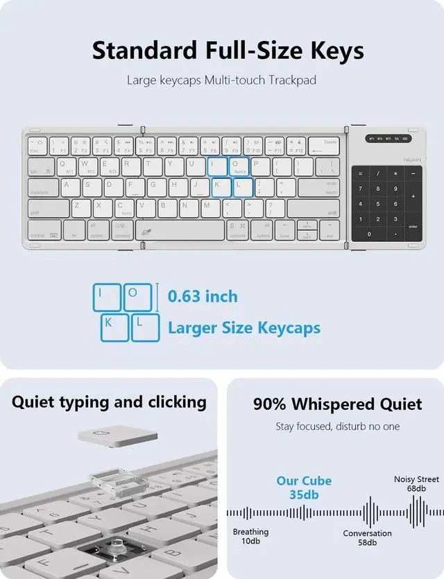 Fold Full-Size Bluetooth Keyboard - Weighing only 9.16 oz, this pocket-sized foldable keyboard features a full 105-key layout with 16mm keycaps. Compact yet functional, it saves desk space while remaining highly portable. Ultra-Thin Flat Profile - With a no-tilt design and simple folding mechanism (no locks required), it unfolds instantly to 13.5" x 4.2" x 0.32". Please confirm dimensions before purchase ^^ Foldable Keyboard with Trackpad - Includes a multi-touch gesture-enabled touchpad for clicking, scrolling, and navigationno mouse needed. The Nillkin Cube folding keyboard is effortless to operate. A detailed user manual is included in the package for a quick and hassle-free setup.