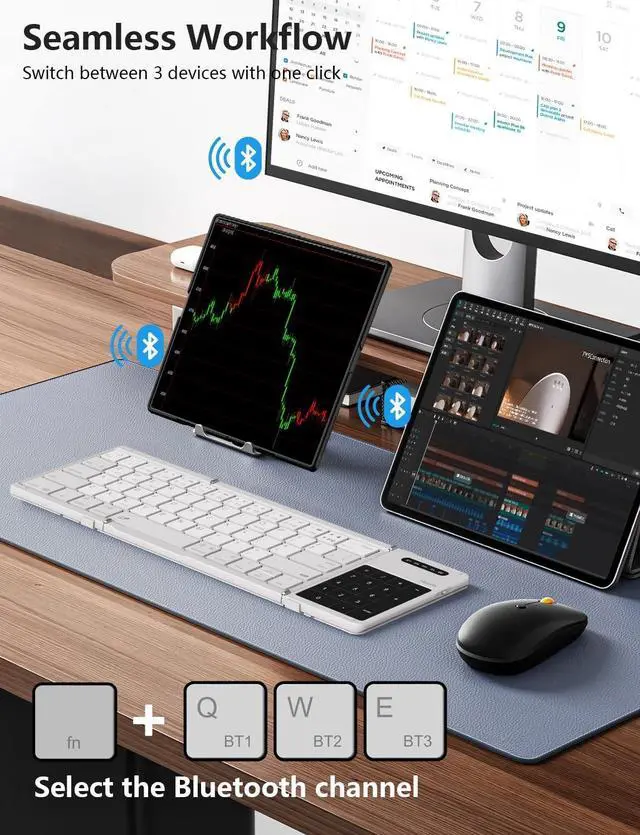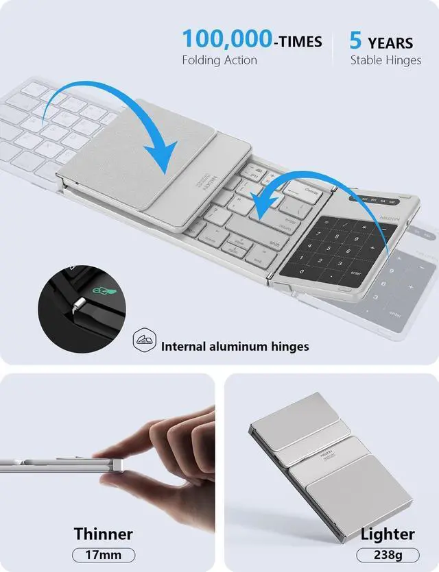 *Notes: 1. iPad users must enable "AssistiveTouch". 2. Some gestures may be app-dependent. 3. Scroll direction customizable in device settings ^^ Travel-Portable Design - Folds to just 7.2" x 4.2" x 0.63". The aluminum alloy hinge has undergone 10, 000+ fold tests, ensuring stable and reliable performance when folding. Includes a custom storage pouch for bags/briefcases. Ideal for travel, cafes, and flights. Use on flat surfaceshinge does not lock ^^ 3-Device Smart Switching -1. Turn on the folded keyboard. 2. Press FN + BT1/BT2/BT3 the corresponding Bluetooth indicator will blink. 3. Press FN + C to enter pairing mode. (Do not skip this step. ) Enable Bluetooth on your target device to connect. Lag-free up to 33ft.
