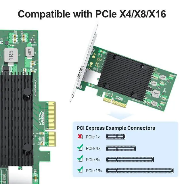 ^^ Multi-rate Connectivity: Supports 100M/1G/ 2.5G /5G/10G, (If the X550 NIC cannot negotiate to 2.5G /5G automatically, please try configuring it to 2.5G /5G manually). Single copper RJ45 port let you connect to network cable for meeting the demands of data center environments. PCIe v 3.0 ( 8.0GT /s) (Compatible with 2.0 and 1.1 ), X4/X8/X16 Lane.