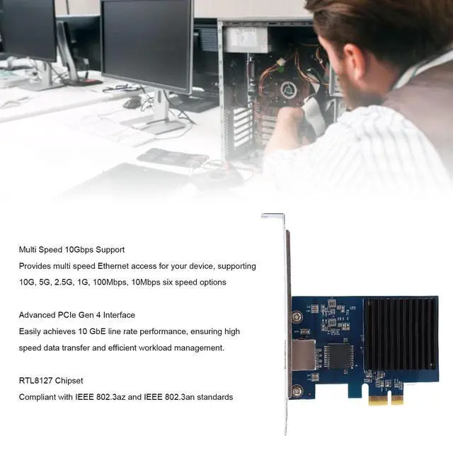 PCIe x1 (or higher) slotSupport: 10Gbps for 100m Cat 6a cable and 5Gbps, 2.5G bps, 1Gbps, 100Mbps, 10Mbps for 100m Cat 5e/Cat 6 cableFully