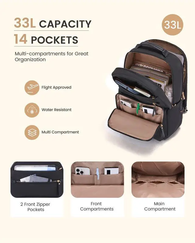 33L Capacity & Easy OrganizationThis laptop backpack, fit for keeping essentials such as A4 folders,books,chargers, clothing in order. With 14 pockets and 4 compartments, including a roomy side pocket for a 40 oz water bottle, it offers convenience and efficiency for daily adventures and short trips.