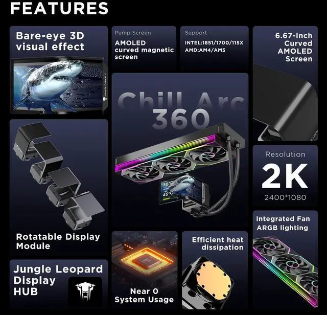 ^^ [Better Cooling]Aluminum integrated heat sink design improves cooling efficiency by 40%. It can handle up to 320W TDP, with fan speeds of 800 - 200010% RPM, three fans with a total airflow of 165CFM, and an air pressure of 2.05 mmH2O, guaranteeing excellent overclocking-level cooling ^^ [Radiator Parameters]Chill ARC 360 water-cooled radiator size of 379 * 120 * 27MM, waterway length of 400mm, pump speed of 2700 10%, fan size of 360*120*25mm, fan speed of 800-200010%, noise 30db (A) ^^ [ARGB Synchronized Lighting]Siamese ARGB Infinity Mirror fans synchronize seamlessly with the motherboard's 5V 3pin header.