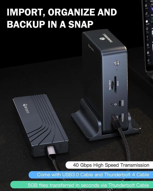 SMART AND LONG-LIFESPAN: This M. 2 SSD Enclosure is equipped with aluminum alloy shell and silent fan. Additionally, this enclosure built-in smart chip and protection design, this enclosure supports UASP and TRIM smart function, Auto-sleep mode saves power and better protects your ssd. ^^ M. 2 NVMe SSD ENCLOSURE - With the built-in JHL7440/JMS583 chip, If your laptop or computer already has the Thunderbolt port, you can directly use this device, and it can reach the same speed as Thunderbolt, 40 Gbps; On the other hand, it's also compatible with fit for USB 3.2 Gen 2x2, making it perfect for quickly transferring large files or backing up your computer ^^ COME WITH USB 4 CABLE AND THUNDERBOLT 4 CABLE - The included cable of this SSD enclosure is also USB4&Thunderbolt 4 Cable, it also supports PD 100W power charging; If you're a video content creator or editor, this device will effectively help you improve your working efficiency.