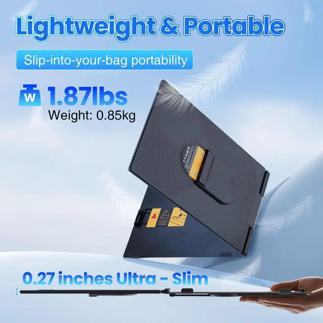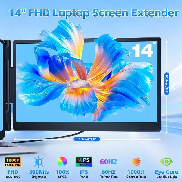 14" FHD IPS Display with Eye Protectionsharanix laptop extender boasts a 14-inch 1080P FHD IPS panel, featuring 300 nits brightness, a 1000:1 contrast ratio, and 72% sRGB color gamut to deliver crisp, smooth visuals. Equipped with blue light filtering and anti-glare technology, it effectively ease eye strain and is very suitable for people who need to handle large amounts of data or work for long hours. ^^ Ultra-Light & Slim, Portable Productivity AnywhereWeighing just 1.87 lbs (lighter than a cup of daily coffee) and only 0.27 inches thin. This portable monitor slides easily into your backpack or laptop bag, adding no extra bulk to your on-the-go lifestyle.