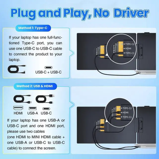 Turn hotel rooms, cafes, classrooms, airports or outdoor spaces into your professional dual-screen workstation anytimeit's perfect for business trips, remote work and mobile study. ^^ Plug and Play, Wide CompatibilityNo drivers or software required! Get instant setup with a single full-featured Type-C cable for video, audio, and power. (For laptops without Type-C, simply use the included HDMI and USB-A cables. ) This dual monitor for laptop works perfectly with Windows, macOS (including M1/M2/M3 MacBooks), Android, Linux, and Chrome OS. Laptops, desktops, mini PCs, set-top boxes, and game consoles with HDMI output interfaces can be directly connected to the display.