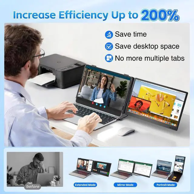 Our support team is ready to assist with any compatibility questions. ^^ Multi-Mode Dual Screen, Maximize Your ProductivityUnlock Extend, Mirror and Vertical display modes to convert your laptop into a dual-monitor setup in seconds. No more constant tab switchingmanage multitasks with ease, handling emails, document editing, data analysis, video streaming, and gaming simultaneously. For anyone who pursues high efficiency, this is undoubtedly a good choice! ^^ 226 Rotatable Screen & Stable BracketThe 226 flexible screen rotation lets you effortlessly share content with teammates or clients in meetings, or adjust for private viewing.