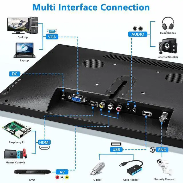 ^^ Wide Compatibility: Multi-Ports including HDMI, VGA, BNC, AV, USB, provide support in your life and work. HDMI port for Laptop, Raspberry Pi, DSLR, or other devices with HDMI port use. VGA port for PC, connected as a small computer monitor; Connected BNC port as a security monitor; AV port for DVD, VCD, TV-Box.