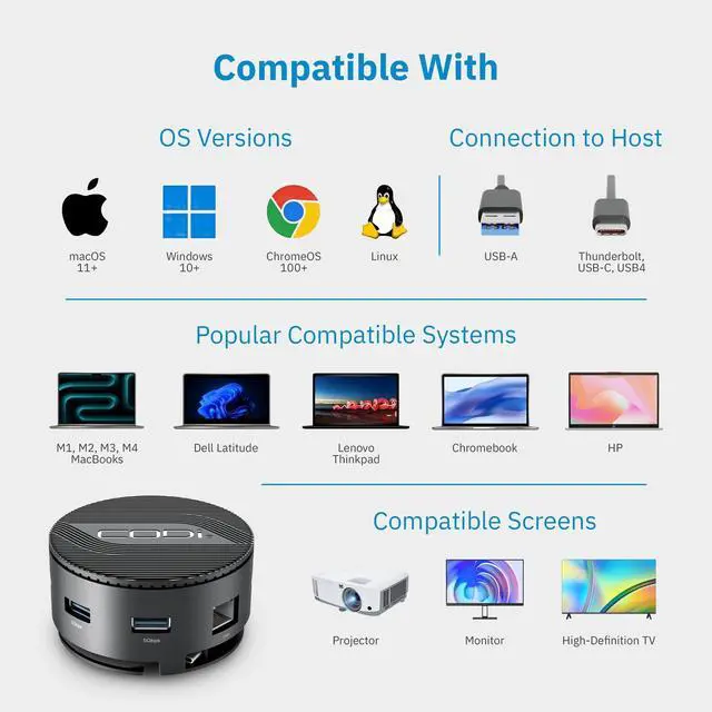 Upgrade your workspace with the CODi CentroM3 Multi-Port USB-C Docking Station. Designed for seamless connectivity and productivity, this USB-C hub transforms your laptop into a powerful workstation with dual 4K HDMI outputs, fast data transfer, and reliable wired networking. The CentroM3 dock features plug-and-play operation, making it the perfect choice for business professionals, students, and remote workers. Its compact and durable design, integrated cable storage, and braided uplink cable deliver maximum portability and performance wherever you go.