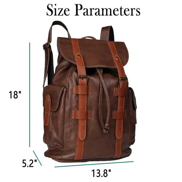 Dimensions: 18" H x 13.8" L x 5.2" W Generous capacity, Perfect for work, travel, or campus life. Holds laptops up to 16, tablets, books, and daily necessities with timeless leather elegance. ^^ Built for