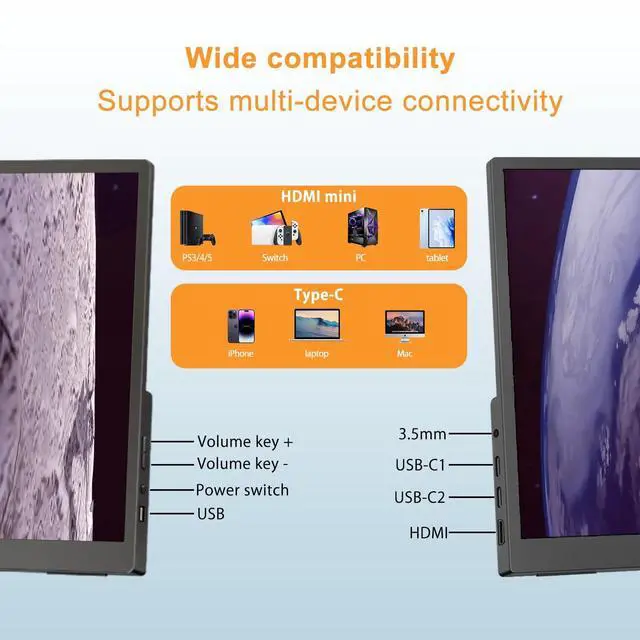 Ideal for gaming, entertainment, work, and streaming. Eye-care technology with blue light reduction and flicker-free design helps reduce visual fatigue during extended use. ^^ Slim, Lightweight & Travel ReadyPortable travel monitor designed with portability in mind, this ultra-thin monitor is easy to carry and fits effortlessly into backpacks or luggage, making it perfect for business trips, travel, study, home office, or on-the-go gaming. A great second screen solution for students, professionals, and frequent travelers. ^^ Versatile USB-C & HDMI ConnectivityThe monitor equipped with a standard HDMI port and full-featured USB-C interface, this portable screen works seamlessly with laptops, desktops, MacBooks, phones, gaming consoles, and moreoffering flexible connection options for different devices and scenarios.