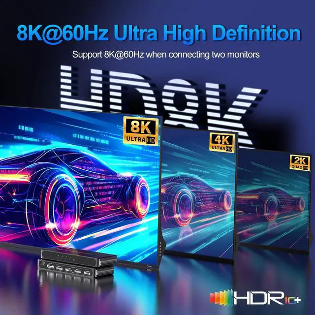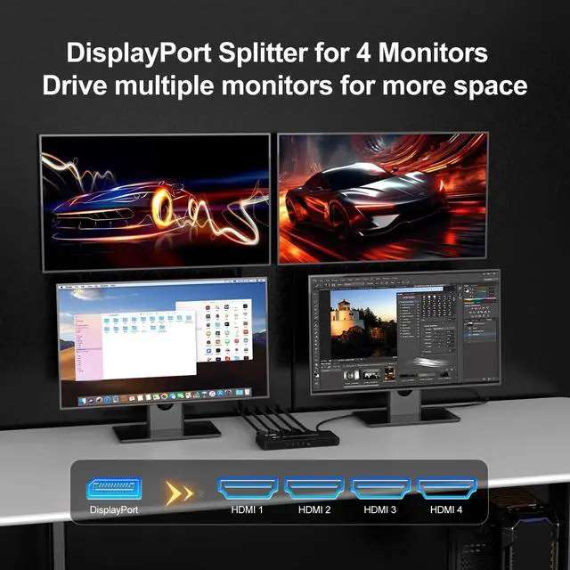 8K 60Hz Ultra HD ResolutionThe displayport mst hub supports 8k@60hz ultra high definition resolution, complies with DP 2.1 standard. Single HDMI output resolution up to 8K@60Hz, backward compatible with 4K@120Hz/60Hz, 2K@120Hz, 1080P@120Hz/60Hz; 4 HDMI screen resolution up to 4K@60Hz (Make sure your input and output devices both support the same resolution) ^^ 5 in 1 DisplayPort to HDMI SplitterThis HDMI Splitter 1 in 4 out is used to extend one DP signal to four HDMI monitors, suitable for expanding your screen setup on multiple monitors for various scenarios such as work, entertainment or presentation, increasing your efficiency and creating more possibilities for you ^^ Two Display ModesThe displayport to hdmi splitter support mirror modes (SST) and Extend modes (MST), Mirror mode (AAA mode) is supported on both Windows and macOS systems.