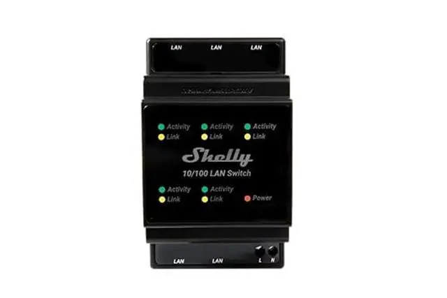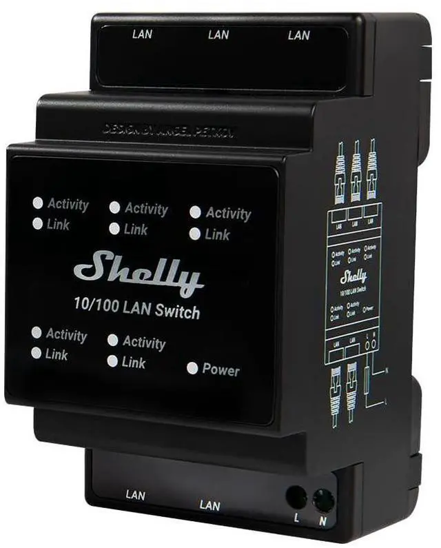 Shelly LAN Switch is a DIN-mountable Ethernet switch with 5 RJ45 ports. It provides a seamless solution to expand your network capabilities without the hassle of extensive rewiring. Enjoy fast 10/100Mbps speeds and intuitive LED indicators for easy monitoring. ^^ The shape you already love - The Shelly LAN Switch provides a simple solution for reliable connectivity without the need for extensive electrical modifications. Now you only need 1 LAN cable in your fuse box to connect your devices! The shape is the same as the Pro-Line devices, ensuring it fits perfectly in a fuse box populated by Shelly devices, simplifying installation and ensuring an organized setup.