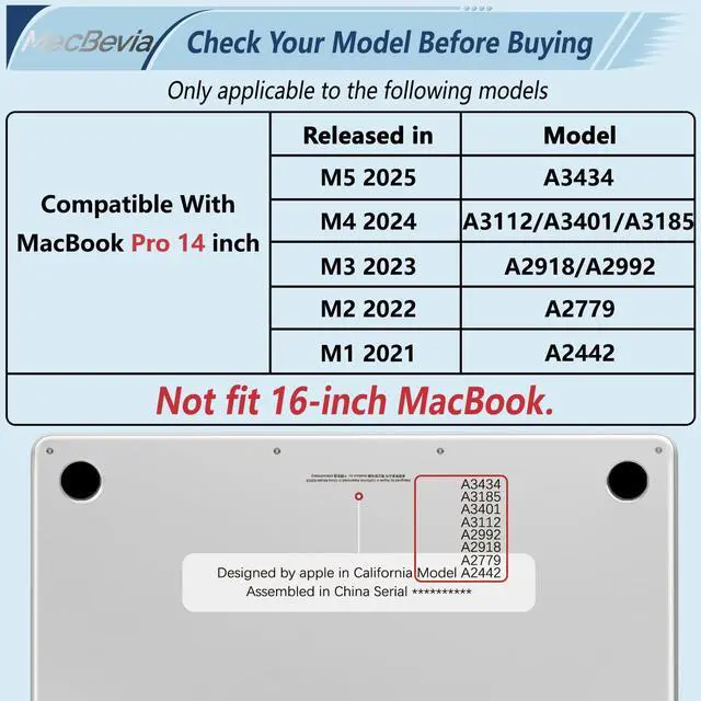Models: M5 A3434/ M4 A3112 A3401 A3185/ M3 A2918 A2992/ M2 A2779/ M1 A2442. Please check the model number on the bottom of your MacBook Pro to ensure compatibility ^^ Comprehensive Protection, Lightweight