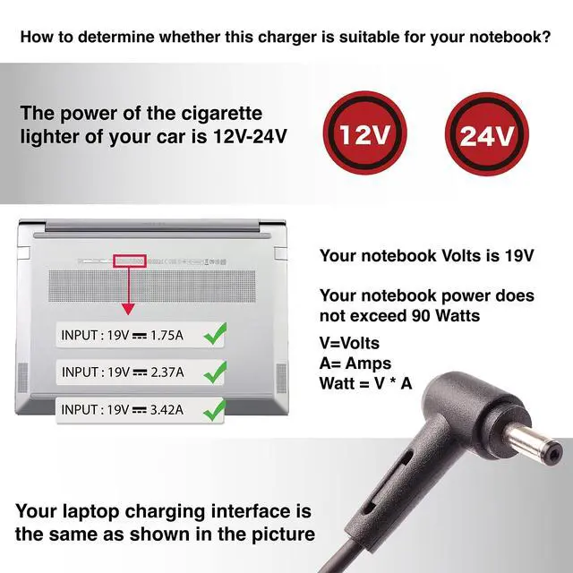INPUT of Cigarette lighter socket12V-24V Suitable for Cars Trucks RV SUV BUS This power inverter for laptop can be also used in boat. Open you new 12 volt power world. ^^ Connector size 4.0 * 1.35 mm (as shown in the Picture), Output 19V 3.42A (also compatible with 2.37A and 1.75A ) ^^ USB QC 3.0 Fast ChargingUSB Port with Quick Charge 3.0 is faster than common chargers. Give you a high speed. suitable for many electronic devices. Charge Smartphone, Galaxy, Tablet, Power bank, Humidifier, Driving recorder while charging your laptop.