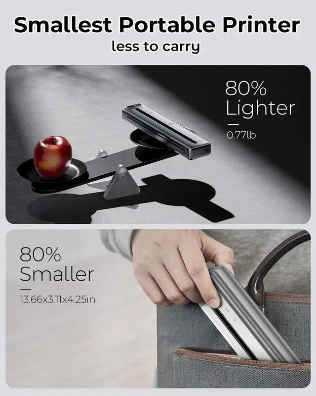 Multi-size Printing]: Design with adjustable paper guide clip, you can print thermal paper or thermal labels within 8.5" /8"/7"/ 5.8" (US Letter/A4/B5/A5) width, widely application for documents, photos, greeting cards, address labels, clipart, etc.; (Only supports monochrome printing) ^^ [Smaller, Lighter, Quieter and Faster