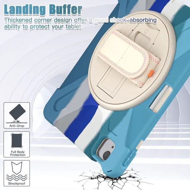 Hand Strap Design: With a 360 rotating hand strap design, this case offers versatile handling options, allowing you to comfortably carry your iPad Air in any orientation, making it ideal for on-the-go use. ^^ Foldable Portable Stand and