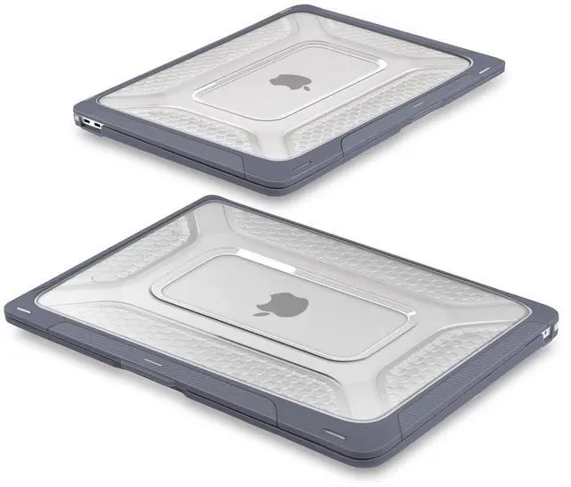 FINGERPRINTS & SCRATCHES: The matte PC back panel features a sculpted honeycomb texture that repels oily fingerprints, minimizes visible scratches, and improves hand grip. It maintains a clean, professional look over time while adding functional grip when carrying or repositioning your MacBook. ^^ PRECISION MOLDING & CENTRALIZED CORE COOLING: The large, centralized rectangular vents work in tandem with the honeycomb structure and elevated stance to maximize heat dissipation from the logic board core. Precision 1:1 laser molding ensures full access to Thunderbolt ports, Snap-on installation with anti-scratch micro-clips allows secure fit and easy removal in seconds.