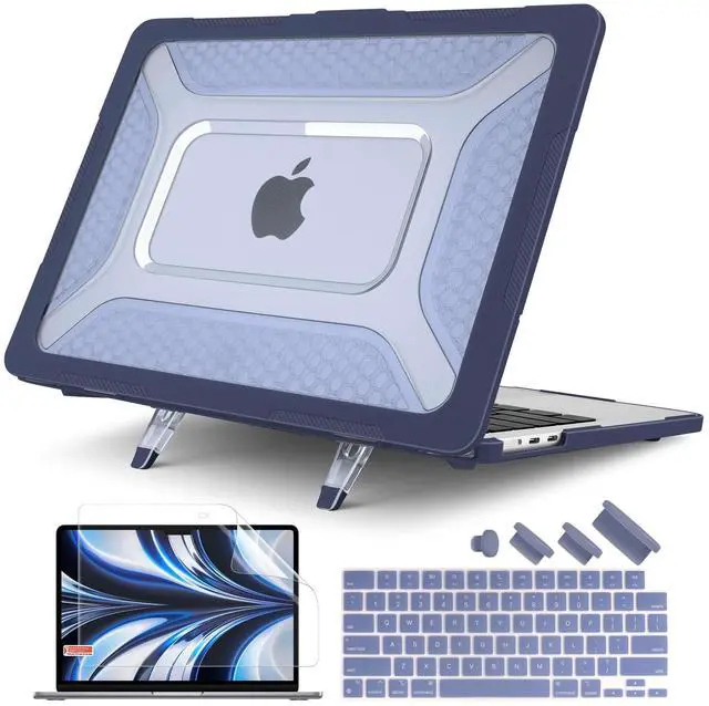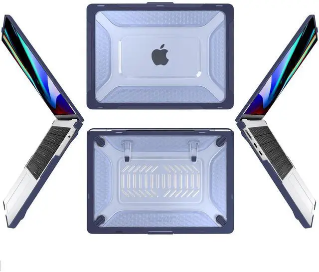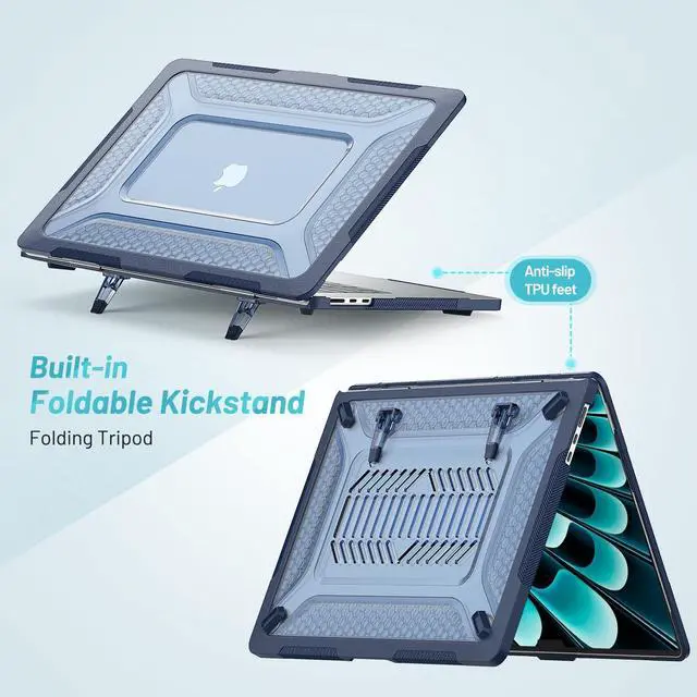 EXTREME-DUTY HYBRID ARMOR BUILT STRONGER BY DESIGN Constructed with a hybrid structure combining a shock-absorbing TPU frame and a sculpted honeycomb-pattern matte PC back, this case delivers extreme-duty protection without brittle rigidity. The TPU edges cushion impact, reduce stress on your MacBook during drops, and are easier to install without risking device damage. making it ideal for professional, academic, and travel-intensive use. ^^ 25-LB LOAD-BEARING DUAL KICKSTANDS TRUE WORKSTATION STABILITY Engineered for real productivity, the reinforced dual foldable kickstands are tested to support up to 25 lbs. Designed for heavy typing, writing, and long desk sessions, they provide a firm, wobble-free platform that outperforms standard decorative stand designs.