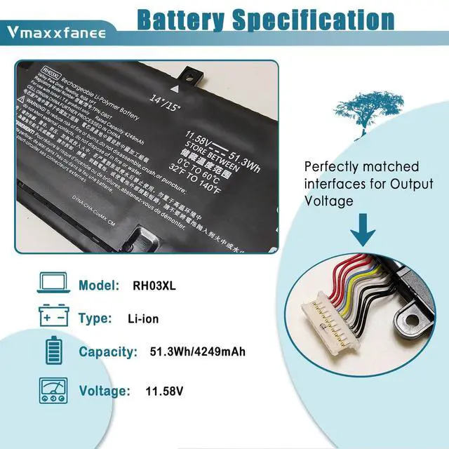 NoteRH03XL has 2 designs (RH03XL 45Wh & RH03XL 51.3W h) They are NOT fit for each other. Theirinterfaces, battery clasp are different. Please open the back case of yourlaptop and check original battery before placing order. This listing is RH03XL 51.3W h. ^^ HP RH03XL