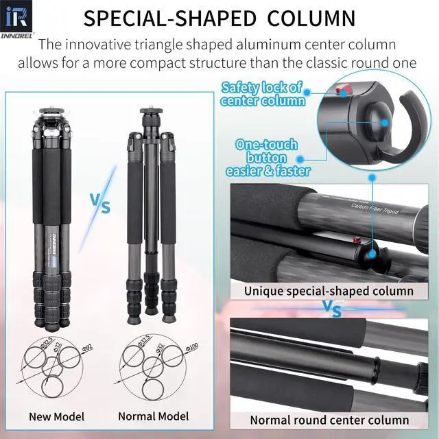 HIGH QUALITY & PORTABLEMade of genuine 10 layers carbon fiber, the tubes are lighter and stronger. The structure of this tripod is compact. The folded length is only 24.4 in/62cm so it is easy to carry and suitable for travel. Other main parts are made with CNC and Anodic Oxidation technology, which make the surface much better and smoother and the color of tripod more well-distributed and exquisite. ^^ SPECIAL-SHAPED CENTER COLUMNThe tripod adopts innovative special-shaped center column design that is more compact than the classic round shape. This unique triangle shaped center column can save more space.