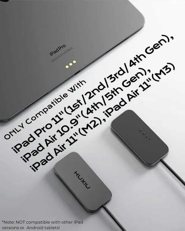 Compatibility: This magnetic charger is exclusively compatible with iPad Air 11in M3 (2025), iPad Air 11in M2 (2024), iPad Pro 11in (1st/2nd/3rd/4th Gen), and iPad Air 10.9 in (4th/5th Gen).