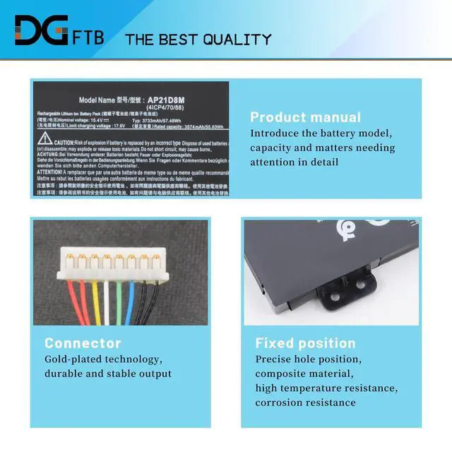 Capacity: 3733mAh 57.48W h ^^ Compatible P/NAP21D8M ^^ Compatible Models for Acer Nitro 5 AN515-46 AN515-47 AN515-58 AN515-58-56CL AN515-58-766R AN515-58-72QR AN515-58-74JS AN515-58-75UH AN515-58-77YC Series; Replacement for Acer Nitro 16 AN16-51 AN16-51-74BV AN16-51-78GX AN16-51-76BS AN16-51-56VT Series; Replacement for Acer Nitro V 15 ANV15-51 Series ^^ DG QualityGrade A cells mitigate the risk of battery leakage and maximize output stability. Built-in circuit protection, enhances safety of usage and extends battery life ^^ DG TIPSFor the initial installation, please reinstall and check the interface fully connected, discharge the battery to 5%(not to 0%) and then charge to 95%, and cycle 3-4 times