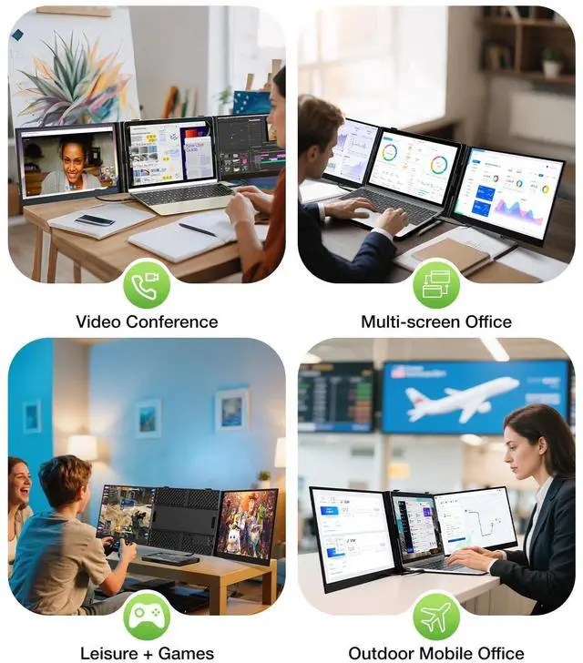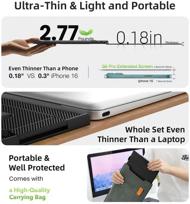 Ultra-thin & Ultra-light Portable DisplayThe 15.3 inch Full HD laptop screen extender with 1920*1200 resolution is just 2.77 lbs and each screen is only 0.18 and it is a truly portable monitor extender for laptops and easy to take anywhere. Thin as cicada's wings. See more. Carry less. The extended screens can be used for office work, video conference, travelling, mobile work, games & leisure and business. It can even charge your laptop in reverse to address the limited interfaces. ^^ Double Screen Double EfficiencyThe laptop monitor extender attached to your laptop can get triple screens for usage.