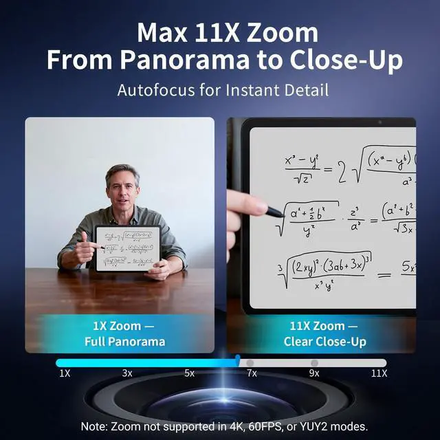 4K Dual-Camera Precision The World's 1st Dual-Camera for Streaming features 2 cameras sharing a 1/ 2.8 CMOS 4K sensor for superior clarity. The left gray wide-angle camera captures panoramic scenes with near focus for people and backgrounds, while the right blue telephoto camera delivers detailed close-ups at a recommended distance of 13.8 in. Switch freely between full-scene and close-up views to present every detail vividly in streaming, teaching, product demonstrations, or remote meetings. ^^ Max 11X Hybrid Zoom & PDAF Autofocus The 4K webcam for PC offers smooth zoom from 1X to 11Xwith examples like 3X, 5X, 7X, and Max 11Xfor seamless transitions between full-scene and close-up views.