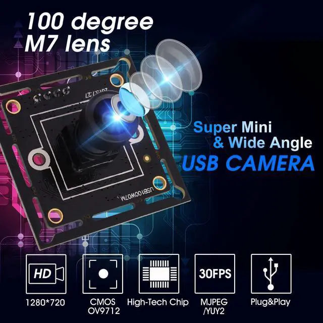 Max 1280X720@30fps HD 720P high resolution, high pixel technology for sharp image and accurate color reproduction. ^^ 100 degree M7 lens usb webcam for wide angle video image, FOV (H) 93degree, FOV (D) 98degree. High quality lens, true and undistorted color image. ^^ USB 2.0 high speed mini size 32x32/26x26mm for PC camera interface, super small outline and thin profile for embedded applications. ^^ CMOS OV9712 sensor for high quality image and low power consumption ideal for portable equipment. Free driver, easily used, plug and play. ^^ 1 Meter usb cord cable, support raspberry pi, opencv etc.