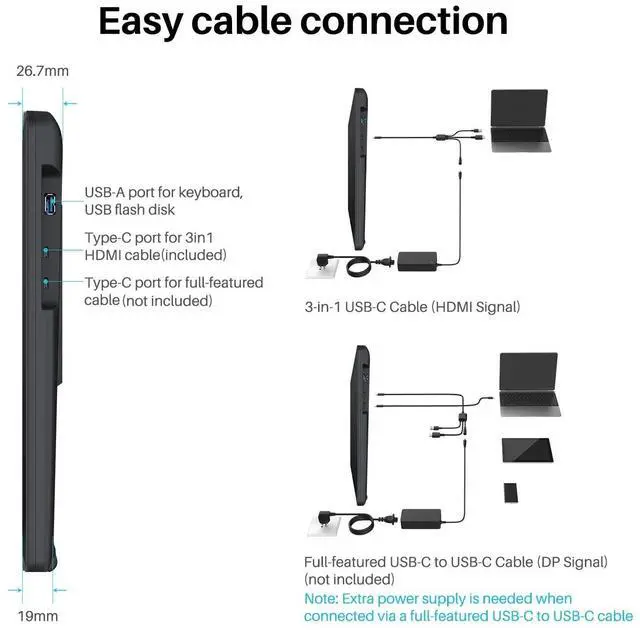 ^^ Easy Cable Connection: Two USB-C ports equipped on Kamvas 22 digital drawing tablet allow you to connect the pen display to the computer, Android phone or tablet via a 3-in-1 cable or a USB-C to USB-C cable (optional). While the USB-A port is designed for the connection to external peripherals such as keyboard, USB disk, etc.