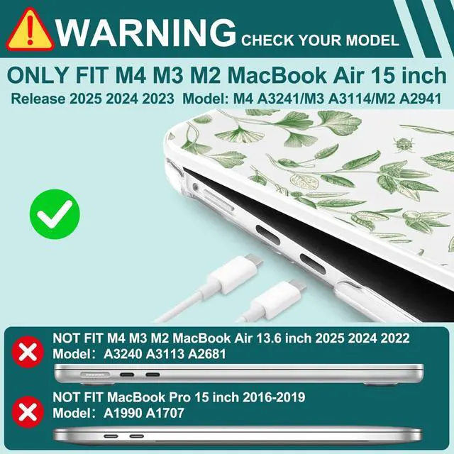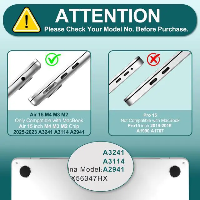 Compatible With - Only for M4/M3/M2 MacBook Air 15" 2025 2024 2023 (Only compatible model: A3241/A3114/A2941). Please confirm the model on the bottom of the MacBook before ordering ^^ Durable Material - MacBook Air 15-inch case is made of hard PC material, effective anti-slip/shockproof/anti-scratch etc ^^ Case Design - The case adopts the top and bottom case separation design, easy to install and remove ^^ Case Port Design - Precise cutouts allow full access to all ports, features, buttons, and Touch ID functionality ^^ Package - Included 1 MacBook Air 15 inch Case, 1 Keyboard Cover, 1 Trackpad Protector, 2 OTG Adapter