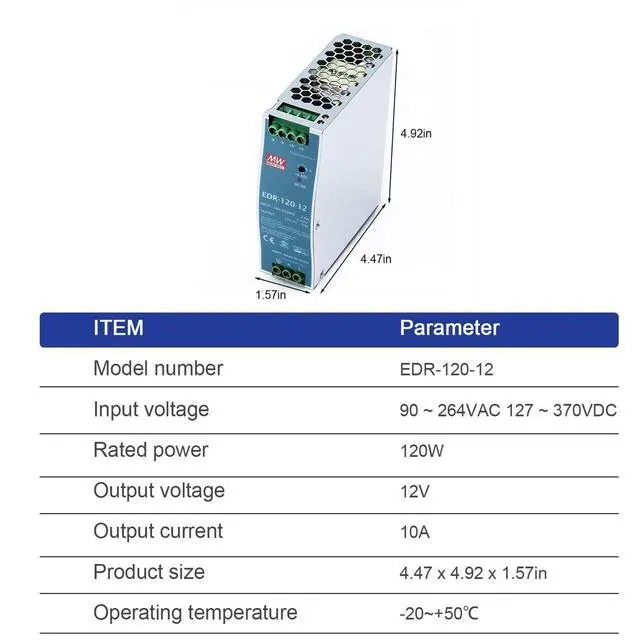 The EDR-120-12 is a high-quality 120W single-output DIN rail power supply that delivers 12V DC output voltage with up to 10A current. It features a highly efficient design with up to 85% efficiency, effectively reducing energy consumption and heat generation. This power supply has built-in overload, overvoltage, and overtemperature protection to ensure safe and stable operation in various industrial environments. Certified to UL, TUV and other international safety standards, the EDR-120-12 ensures reliable performance and is an ideal choice for industrial automation, instrumentation, and other applications.