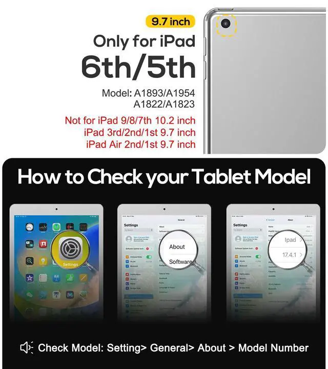 Compatible: Protective case only for Apple iPad 6th Generation 9.7 inch 2018 (Model number: A1893/A1954) iPad 5th Generation 9.7 inch 2017 (Model number: A1822/A1823). Please check the model number on the bottom back of your iPad.