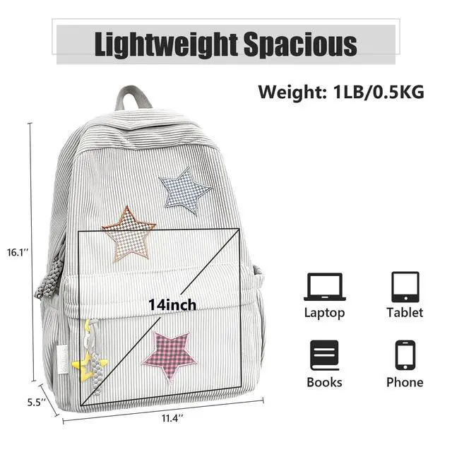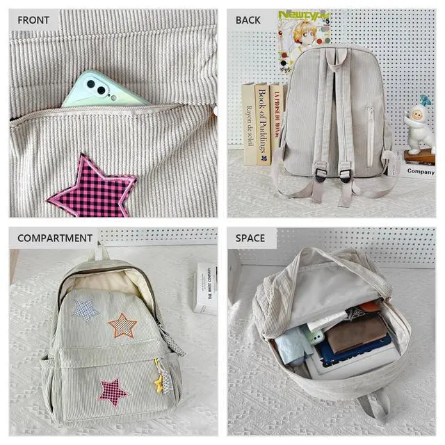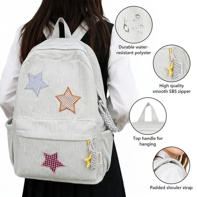 Corduroy Material: The Corduroy Backpack with Star Pattern features skin-friendly corduroy fabric that feels comfortable to the touch and resists minor scratches. It also offers excellent water resistance, so you won't have to worry about your belongings getting wet. If you're looking for a backpack that's both comfortable and fashion, this is a great choice. ^^