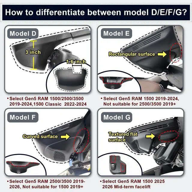 Your RAM: 1 Check Your Vehicles Year Select the correct dash cam based on your RAMs generation. 2 Match the Right Model Refer to product images for compatibility details. For 4th Gen (Older RAM) (2013-2018 RAM 1500/2500/3500 & 2019-2024
