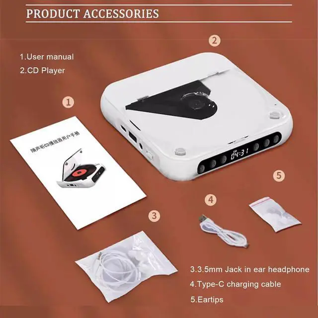 ^^ Package contents: 1x CD Player, 1x Type-Charging Cable, 1x 3.5 mm Jack in Ear Headphone, 2x Eartips, 1x User manual