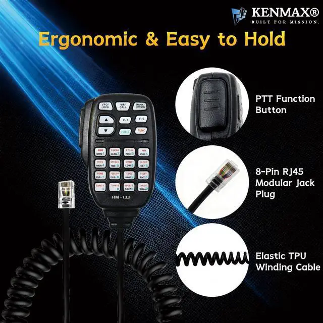ICOM Mobile RadiosDescription: This professional-grade handheld microphone is designed for ICOM mobile radios. It uses an RJ45 8-pin modular plug for a secure and stable connection. The mic housing is made of high-impact durable plastic, providing long-lasting reliability in mobile and outdoor environments. The high-sensitivity microphone element ensures clear and crisp audio transmission, even in noisy surroundingsideal for both amateur and professional radio operators.