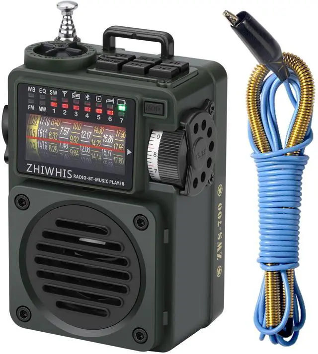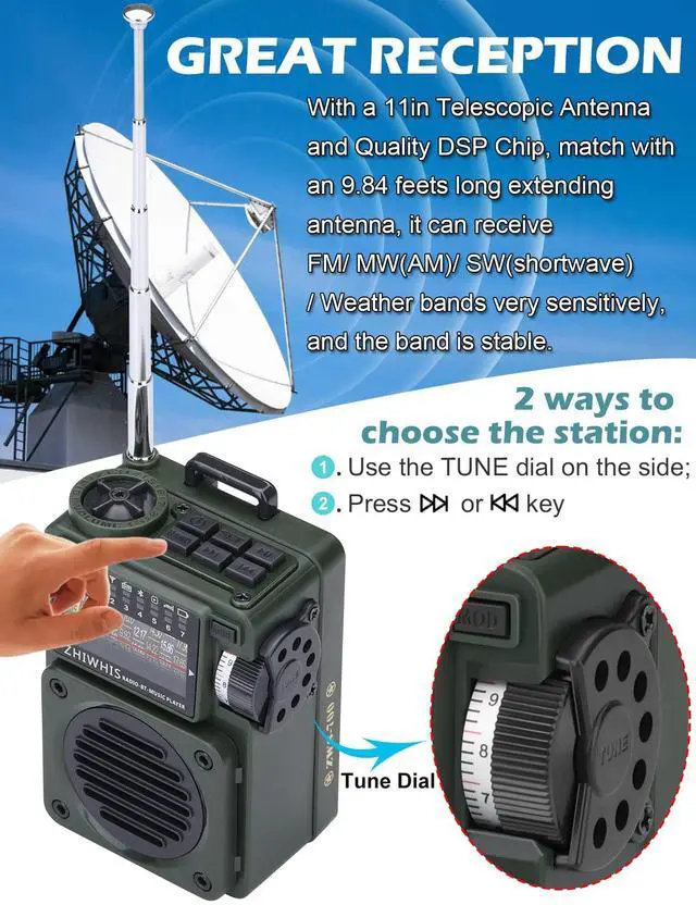 [Powerful Speaker, Military-style Design] - This multi-functional speaker, which has three playback modes - Radio, Bluetooth 5.0, and TF/MicroSD card, is a must-have tool for listening to music. Inspired by military-spec equipment that combines elements of ammo boxes, camouflage, steering wheel, and armored vehicles, gives it a bold style with rugged quality. ^^ [Superb Sound, Simple Operation] - The extremely loud and crisp sound through a high-performance driver and a unique enhanced bass brings you the best music sound. The Weather radio can store 110 stations and sets up two choose station methods, including use the TUNE dial and press key.