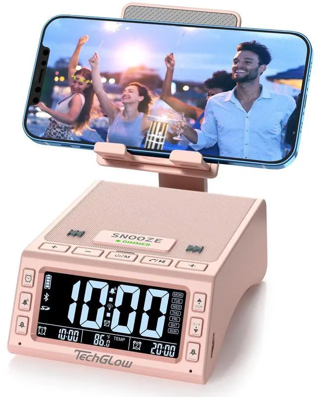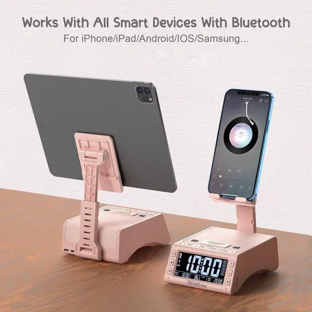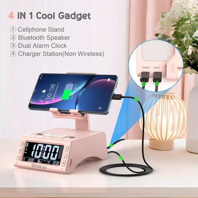 The phone speaker stand for desk is a very useful gadget when you take cooking lessons, make up lessons and other DIY lessons. You can easily follow them step by step without holding the phone, hands free. ^^ Dual Alarm Clock with LCD ScreenThis digital dual alarm clock can set 2 different alarms, convenient for family members with different schedules. A basic clock with enough practical functions for daily use: 5-level adjustable alarm volume, 4-level digits brightness dimmer, SNOOZE function for extra 5 mins sleep, room temperature sensitive, 12/24H function is also available. ^^ Charging Station-Play While ChargingGet your smartphone or tablet charged while watching videos or playing music with this Bluetooth speaker charging dock. No more worrying about phone battery running out in the middle of having fun.