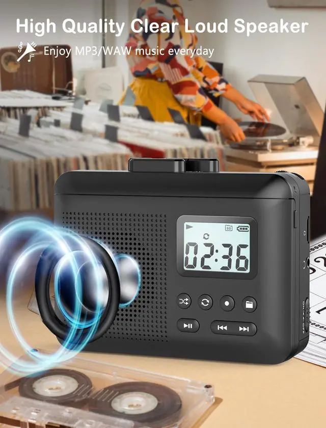 This cassette player has a 1000mAh rechargeable battery. This way we don't need to change the batteries as often either. It only needs to be charged for 2 hours, you can take it outside and enjoy the tape playback for about 7 hours. ^^ High Quilty Sound & 3.5 mm EarphoneThis cassette player converter built-in 3W speaker with crystal clear and lossless playback. Easily fill the entire room with music. This means you can enjoy the high sound quality and even play your precious old cassette clearly. Besides, if you want better sound than the tape itself, the portable cassette player also has a 3.5 mm earphone jack.