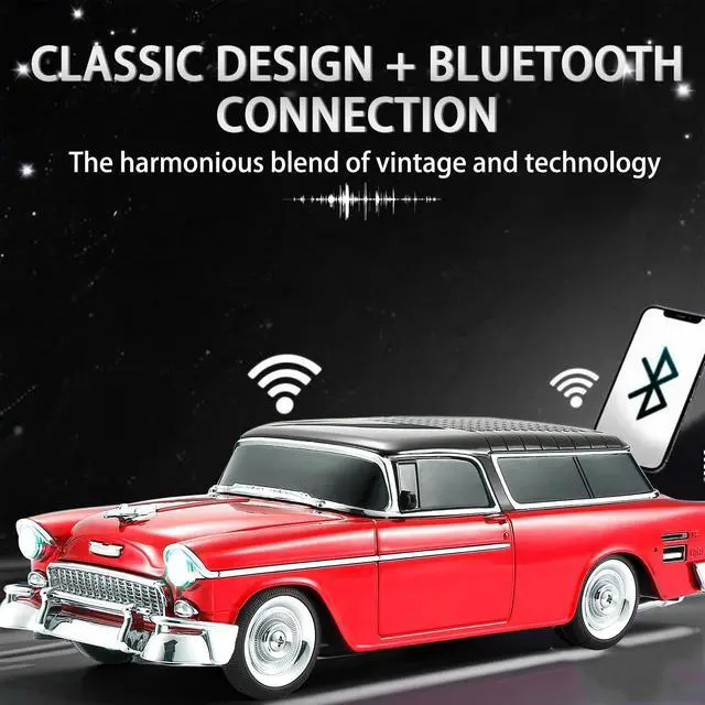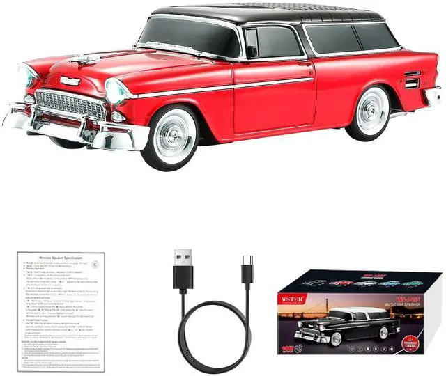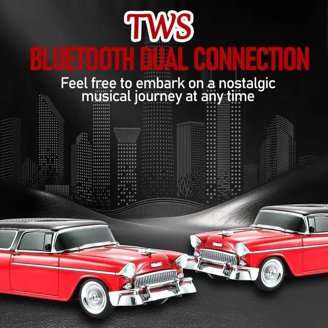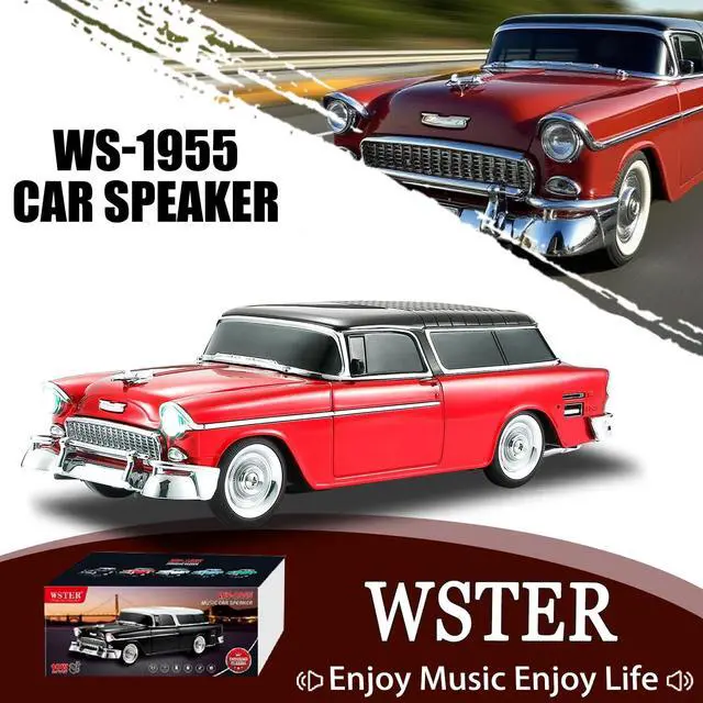 Retro Sedan Design with Movable Wheels Vintage-inspired car model speaker featuring fine detailing and movable wheelsideal as desktop decoration or for car enthusiasts who love collectible electronics ^^ HD Sound + TWS Stereo Pairing Enjoy clear vocals and punchy bass with HD sound. Connect two WS-1955 units in TWS mode to create a broader stereo soundstage for home audio speakers or outdoor fun ^^