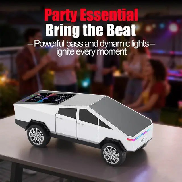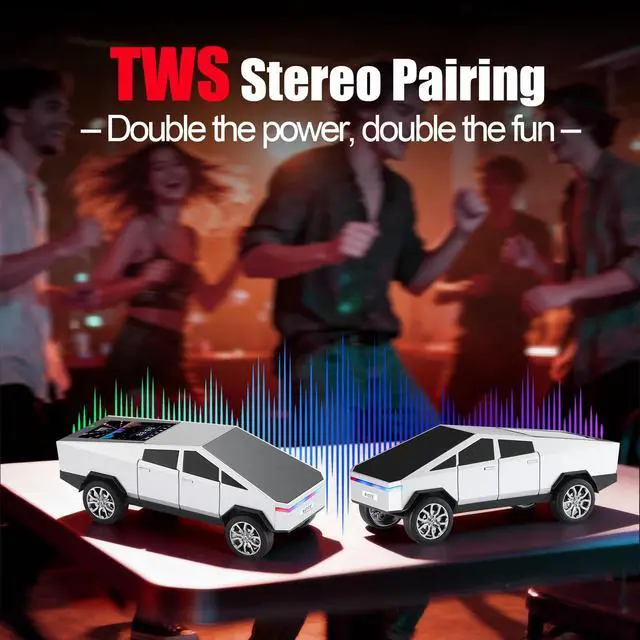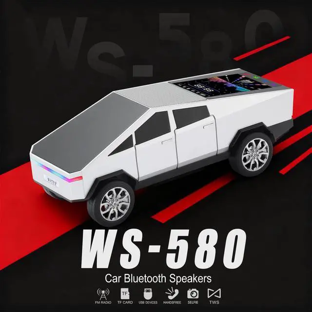 Futuristic Pickup Replica with LED Display Screen Modern truck-based design with movable wheels and an integrated LED display screen that shows basic mode and playback information. ^^ HD Sound with TWS Stereo Linking Provides clear and balanced audio. Pair two WS-580 units via TWS for a wider leftright stereo layout. ^^ Multiple Playback Sources Supports Bluetooth wireless streaming, USB flash drive playback, TF card input, and FM radio for flexible use. ^^ Front LED Lighting Headlight-style LEDs highlight the truck model form with simple illumination. ^^ Built-in Microphone & Type-C Charging Hands-free calling supported through the integrated mic, with Type-C charging for straightforward daily power.